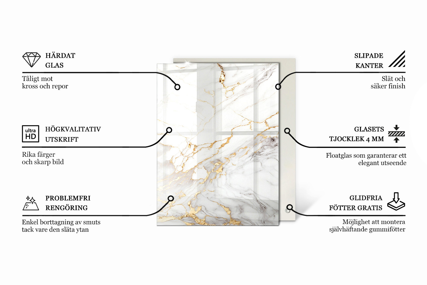 Introducera en unik accent i ditt hem och förändra bordets utseende med en glasskiva med motivet Mönster som imiterar marmor. Detta är inte bara en funktionell del av din möbel – det är en äkta prydnad som drar blickarna till sig och ger rummet en modern men samtidigt elegant känsla. Den rektangulära formen gör att bordsskivan passar utmärkt till många typer av bord, från klassiska träunderreden till mer moderna designben. Tack vare den sofistikerade finishen reflekterar ytan ljuset subtilt, vilket tillför rymd och en känsla av lyx. Det är ett utmärkt val för dig som vill ge din inredning en unik stil utan att kompromissa med kvaliteten.