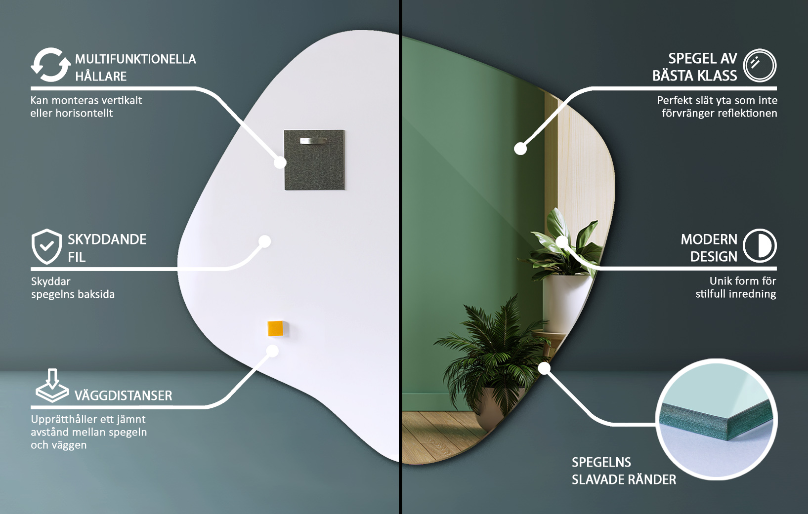 Baksidans skyddsfilm kan variera i färg jämfört med bilderna, men detta påverkar inte produktens egenskaper eller hållbarhet. Välj denna spegel i form av en fläck när du vill kombinera långsiktig kvalitet med stilren originalitet.